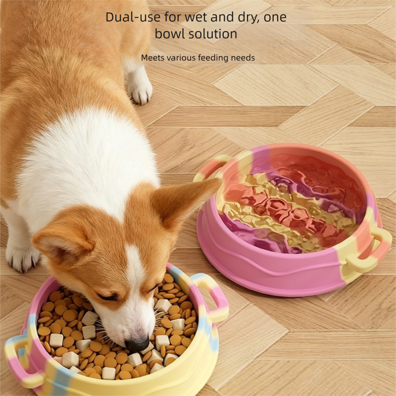 A slow-feeding pet bowl designed for your pet to promote a healthy and slow diet! There are bright colors to choose from (gradient blue-green, rainbow pinkish-orange, multi-color pinkish-yellow and pure yellow), and each bowl has an interactive maze design with built-in handles for easy lifting. The maze structure slows down the eating speed, prevents bloating and overeating, and the durable and non-toxic materials ensure safety. Suitable for dogs and cats of all sizes, this bowl combines fun, functionality and a colorful style, making it a must-have for pet parents who prioritize the digestive health and mealtime enjoyment of their furry companions.